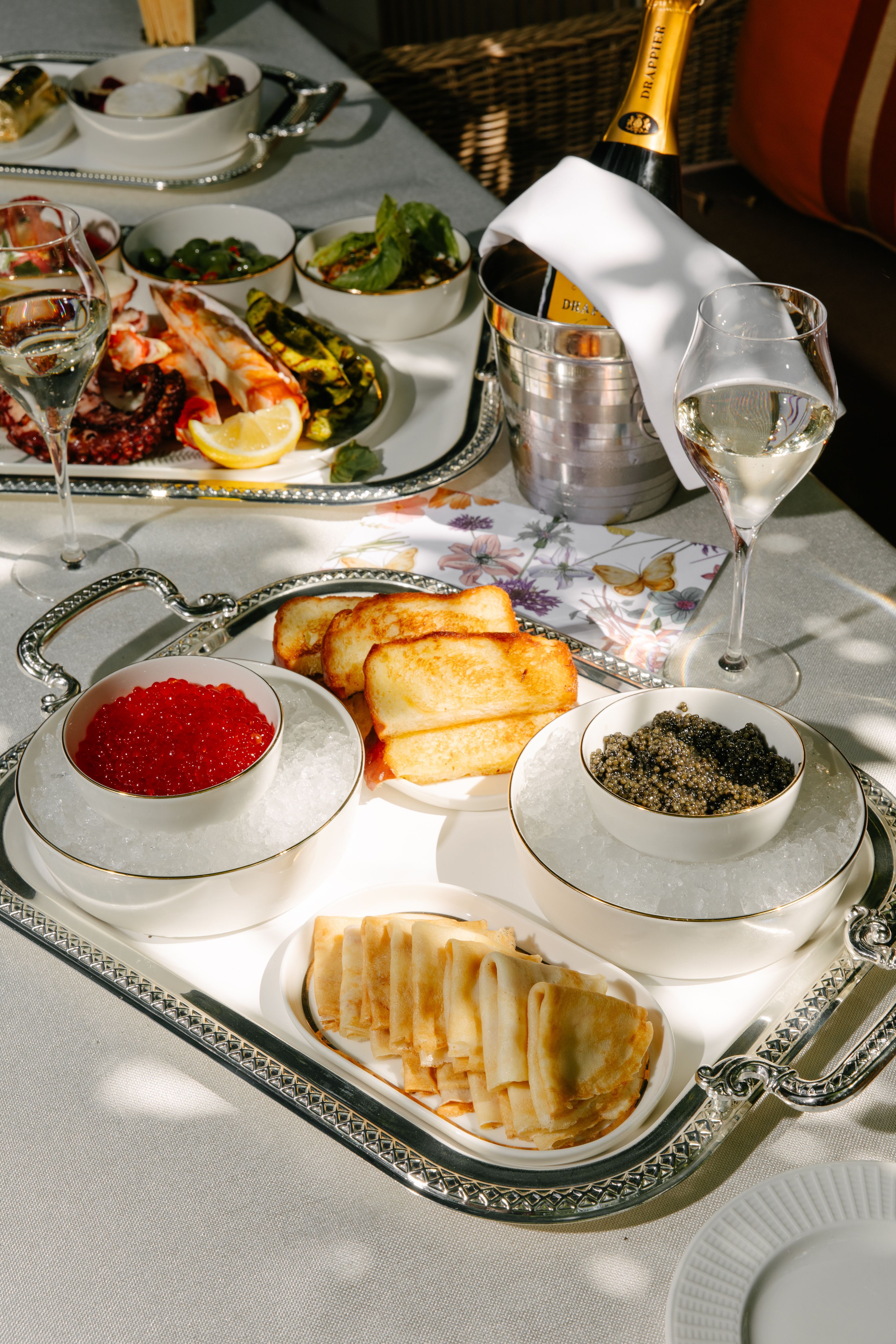 С щедрым размахом в ресторане готовят все то, без чего нельзя представить утро аристократов и ценителей роскоши в рационе. На трех ярусах представлена вся классика изысканной кухни: на первом — морепродукты и закуски: фаланги краба, осьминог, морские гребешки, страчателла с тремя видами томатов, тартар из копченого угря с гуакамоле и сливочным сыром, авокадо-гриль с соусом чимичурри, оливки чупадедос. На втором — икорный бар из черной и красной икры с пшеничными блинами и тостами из сдобной бриоши. На третьем — авторский муссовый десерт в виде головки сыра бри, покрытого сусальным золотом, с начинкой из манго и белого шоколада.