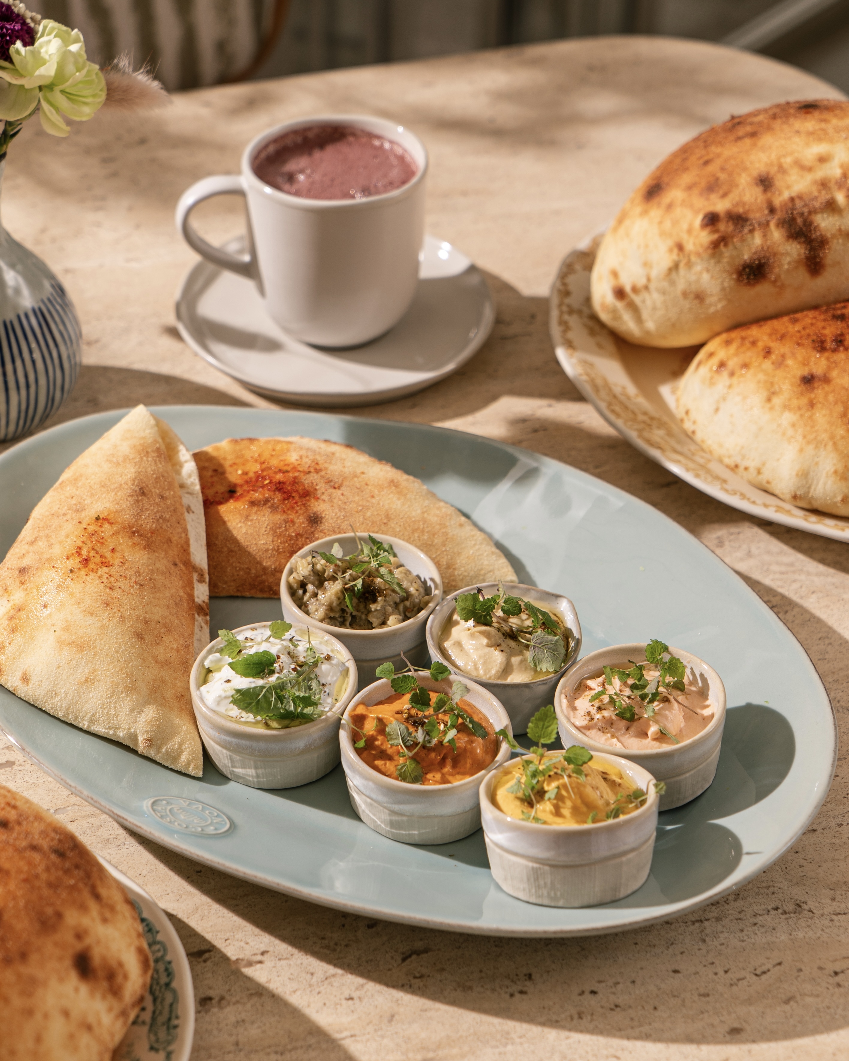 Средиземноморскими бранчами в ресторане с греческими акцентами названы две страницы спешл-меню, где собраны шесть разделов блюд: из яиц, каши, лепешки, сладкие, не сладкие и рекомендации от шефа. Последние самые интересные — многосоставные позиции идеально подходят на случай, когда сложно сделать выбор и хочется попробовать фирменную подачу в атмосфере а-ля Санторини.