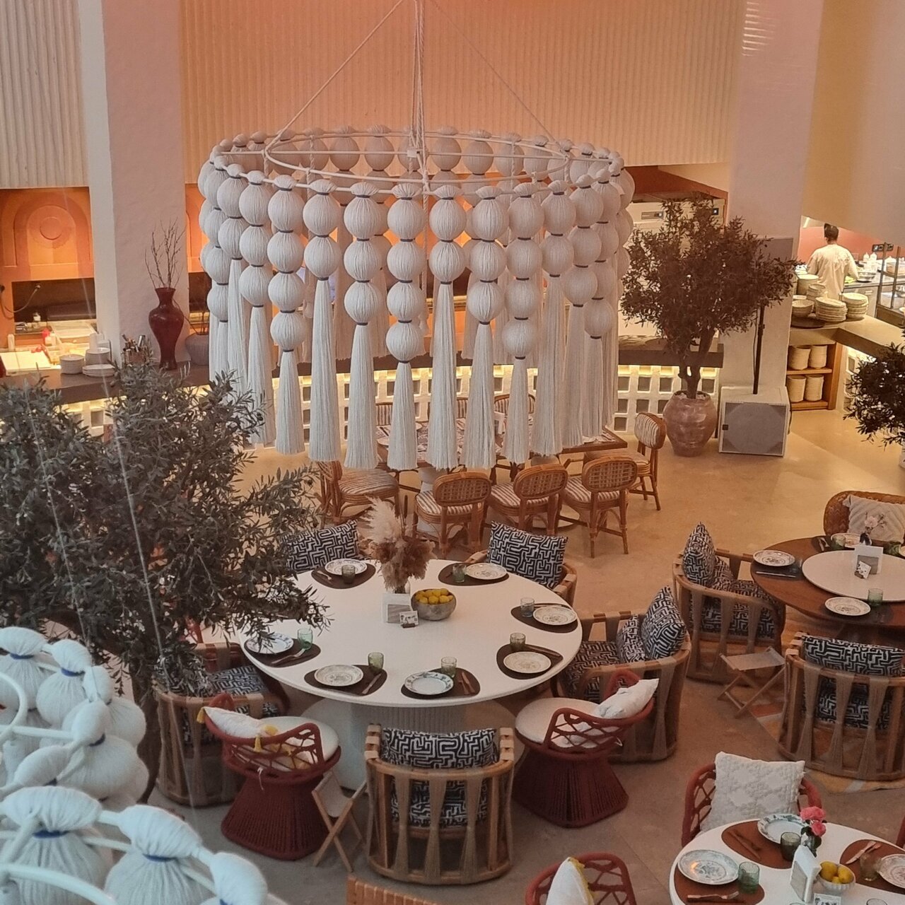 Два этажа масштабного проекта заняли 450 квадратных метров и полностью посвящены традициям Средиземноморья. С улицы видно панорамные окна террасы и входную группу, украшенную сочной гирляндой, имитирующей ветви цитрусовых деревьев. Стены внутри оформлены с применением техники мазанка, на них встречаются узоры насыщенно-синего цвета, в такой же гамме выполнены рукомойники рядом с уборными, соседствующие с гирляндами из красных цветов — оммаж пейзажам Санторини. Главный зал с шестиметровым потолком напоминает сцену, вокруг которой построено остальное пространство: винная комната, стойка, за которой готовят блюда с мангала, и дровяная печь, чуть подальше виднеется детская комната с услугами няни, а сверху нависает антресоль — неполноценный второй этаж, вид из которого захватывает дух. Смысловыми акцентами являются живые оливы, расставленные по всему периметру.