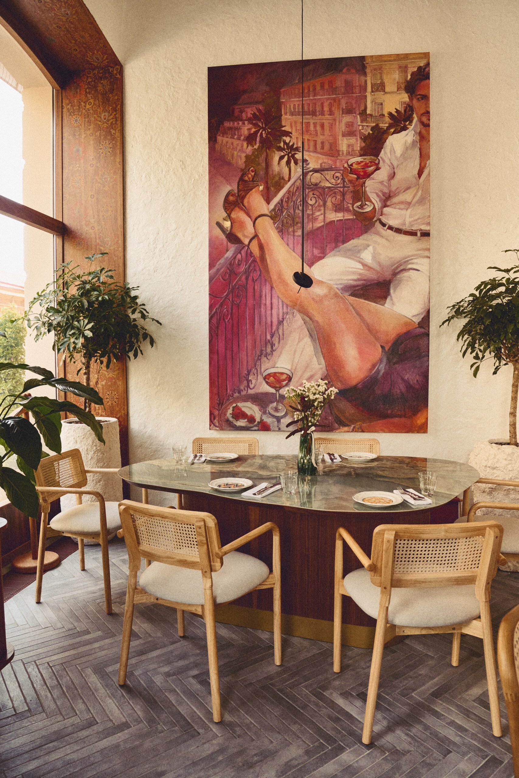 Деревянные стулья, букле на диванах и тяжелые портьеры, картины с изображением встреч героев сторителлинга Вивьен и Себастьяна задают кинематографический тон. Сценами киноленты выступают станции кухни — в одной виртуозно проливают коктейли, в центральной шеф с командой орудуют над горячими блюдами, еще две отведены под холодный и кондитерский цех. Посадка достаточно плотная — как во французских бистро. Но пространства и объема добавляют высокие потолки — 4,2 метра и окна в пол. Когда включается подсветка, имитирующая закатные лучи, создается легкий эффект иллюзорности происходящего, но к чувствам возвращает задача выбора блюд.
