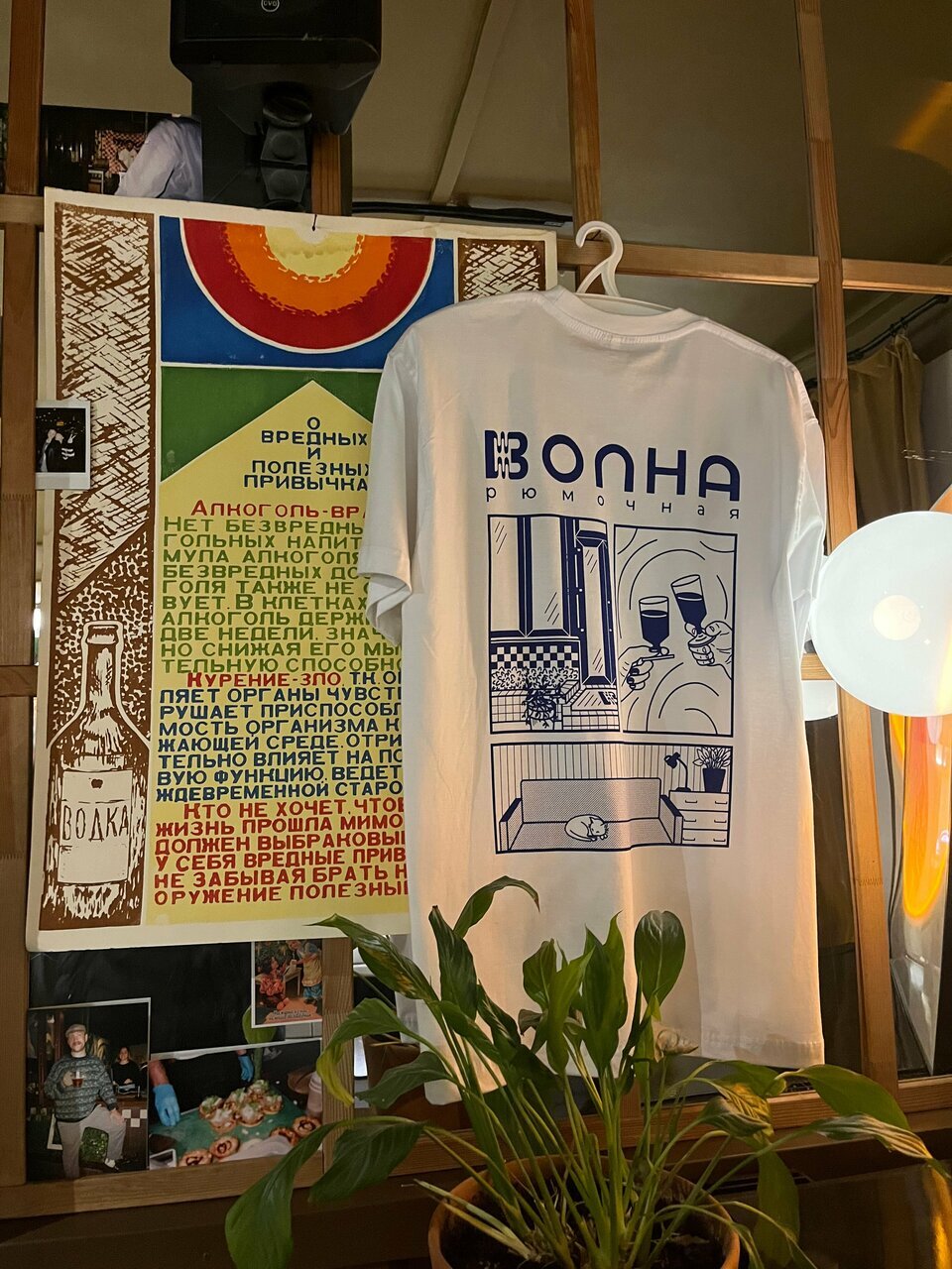 Стильный интерьер с яркими акцентами и ретро-деталями вроде эмалированных кружек вместо салфетниц, винтажной чугунной раковины и легендарной метлахской плитки. Постеры стрит-арт-проекта мастерской «Демоны печати» печатают на старом прессе, используя деревянный наборный шрифт. Часть тиража клеят на улицах, а из оставшихся собирают коллекцию или продают. И среди этого добра подают классические закуски из маринованных овощей и других home made деликатесов, больше двадцати видов настоек, наливок и дистиллятов — тема горячительных напитков раскрылась в «Волне» максимально.