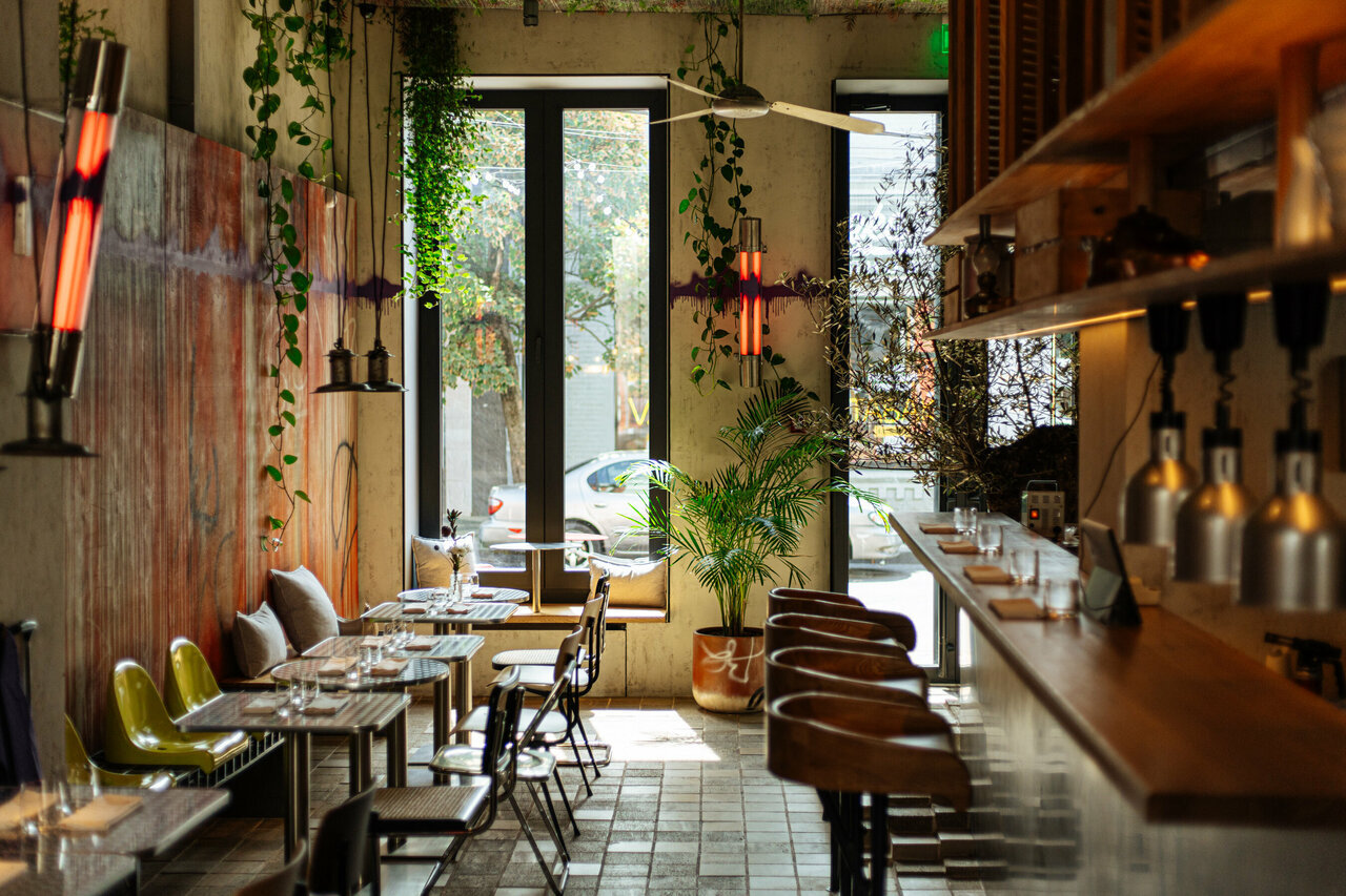 Прогулку по улицам израильской Яффы легко воплотить в жизнь, если перешагнуть порог бистро на улице Карасунской. Тут же под ногами возникает неровное покрытие из брусчатки с перепадами уровня — точь-в-точь древние ступени среди старинных домов. Ближнему Востоку посвятили не только напольное покрытие, но и весь проект. Беспорядок и неопределенность здесь органично приведены к единому целому. Винтажная мебель начала XX века соседствует с уличными пластиковыми стульями и металлическими столиками на двоих, главной фотозоной выступает настоящая 300-летняя олива, а поводом для гастрооткрытий — авторские блюда Дмитрия Ломоносова, выходца из петербургского «Бекитцера».